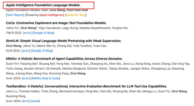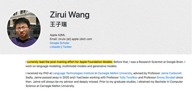 其中王子瑞(Zirui Wang)的头衔层级比较高,在团队里是基础模型后训练负责人(Post-Training Lead for Apple Foundation Models)。