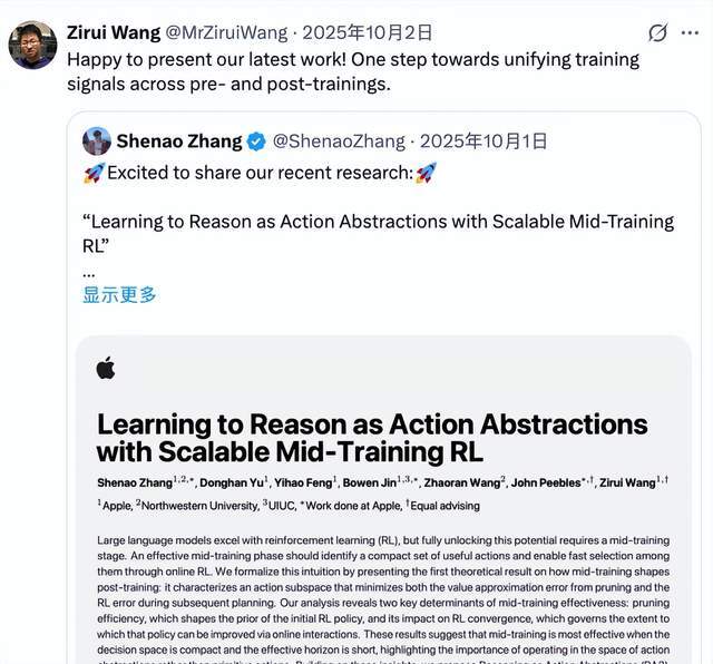 比如在苹果基础模型团队负责后训练的王子瑞,其最后一条主动发布的X消息的内容是分享一篇他参与的最新研究论文的预览/推广。