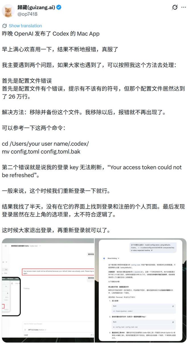 不过,这款应用的初期表现似乎并不完美。知名中文 AI 博主歸藏在社交平台上分享了他的初体验。他提到在发布当晚满心欢喜地安装使用,结果遇到了持续的报错问题。