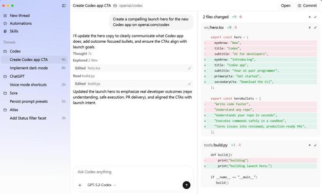 Codex 应用的界面设计相当简洁,核心是一个类似 ChatGPT 的对话框。用户输入需求后,应用会逐条显示生成的代码片段。对话框旁边有一个侧边栏,提供项目文件链接等快捷入口。