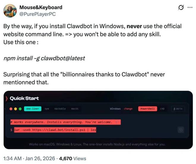 人们一边震撼于这个智能体助理带来的自动化效率提升,另一边也在吐槽其对 Windows 系统的适配。比如,根据一些用户的反馈,如果严格按照官网提供的命令行在 Windows 上安装 ClawdBot,将导致 Skills 功能彻底失效。
