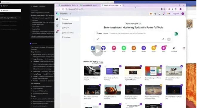 最后是能力扩展,Skywork 内置了 100+ 个经过精选的、真正有用的 Skills 技能包,并将控制权交给用户,既可以手动选择也可由系统根据任务类型自动筛选,操作灵活,覆盖了 Office 三件套生成、网页生成以及图像与视频生成。