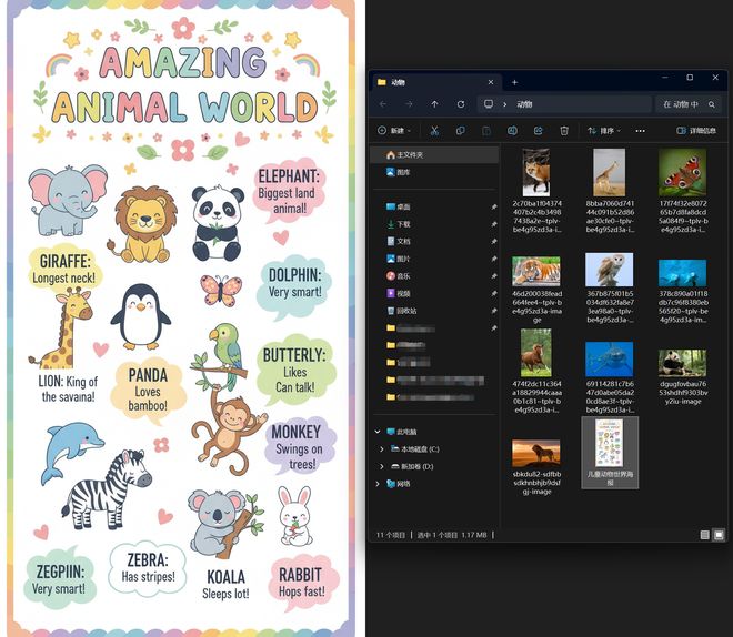 此外,它还可以根据几张动物图片生成一张可爱的海报,给儿童普及动物知识。