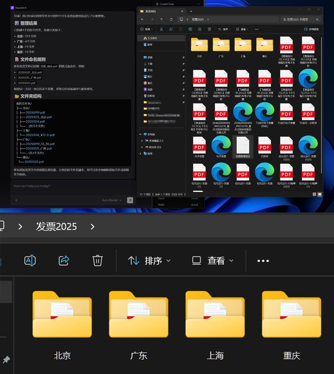 面对海量发票忘记时间和事项的时候,我也可以让它直接帮我按照指定的维度进行分类,并整理在不同的文件夹中,还能将文件按照要求命名,一目了然。