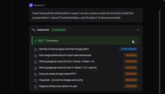 在整个过程中,我只需要交代任务,Skywork 就会自主调用各类工具、模型去分析、执行,最终输出结果。