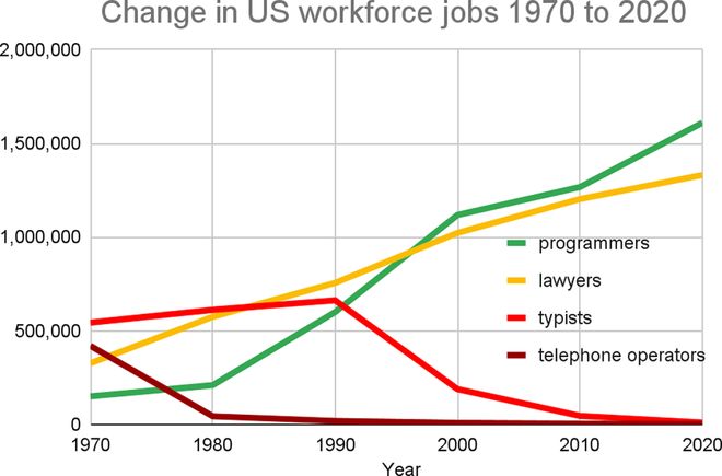 但现实恰恰相反,2020 年美国的程序员数量是 1970 年的 11 倍。