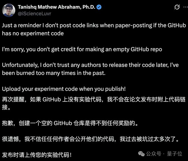 其实,代码仓库放鸽子这事儿也不只是私下牢骚,前 Stability AI 研究总监 Tanishq Mathew Abraham 就直接公开 diss 过这种现象。