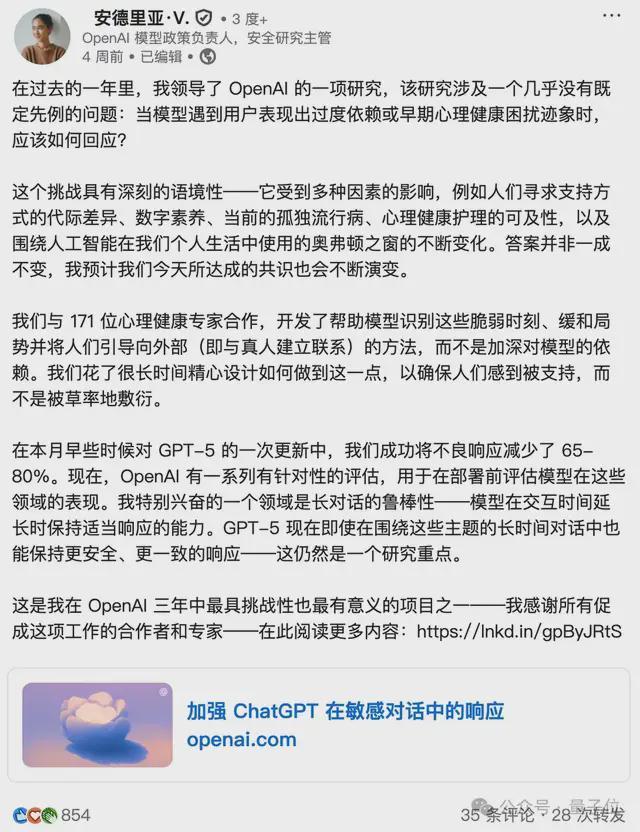 Andrea Vallone在离职信中则把原因说得更为清楚,OpenAI 给她安排了一项“不可能完成的任务”,要求她保护那些对 ChatGPT 产生依赖的用户心理健康。