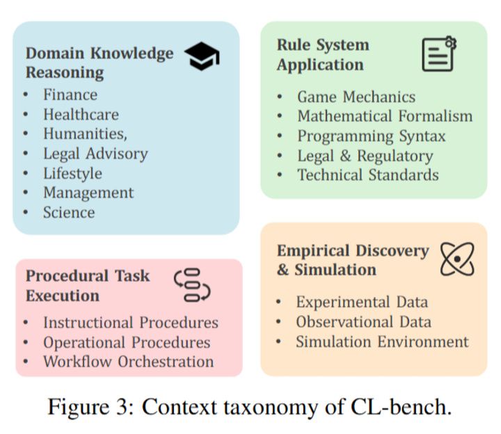 这四类场景基本覆盖了人类在现实工作中遇到的主要学习情境,而 CL-bench 又把这些真实场景搬进了评测体系。