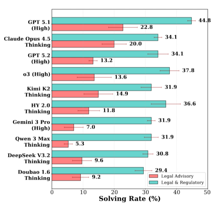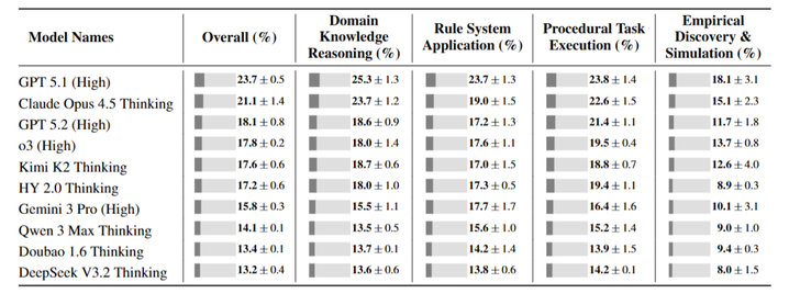 在子类别层面,差异更加明显。在规则系统应用中,法律法规类任务的解决率超过 29%, GPT-5.1 甚至达到 44.8%,但数学形式体系类任务大部分模型都在 15% 以下。