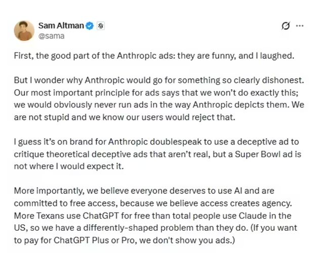 2 月 5 日消息,OpenAI 首席执行官山姆·奥特曼近日在X平台发文,回应竞争对手 Anthropic 在超级碗期间推出的广告宣传,指出其相关表述“存在不实信息”,引发行业关注。