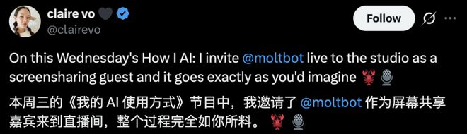 在「How I AI」播客中,主持人 Claire Vo 做了一个大胆的决定:邀请 Clawdbot(化名 Polly)作为屏幕共享嘉宾来到直播间。