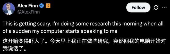 「每当他完成长时间的编码或研究任务时,都会通过语音通知我」,Alex Finn 说。