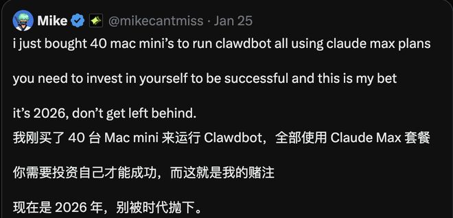 我刚买了 40 台 Mac mini 来运行 Clawdbot,全部使用 Claude Max 套餐,你需要投资自己才能成功,现在是 2026 年,别被时代抛下。