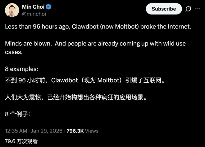 网友 Min Choi 在X平台上搜集了近日最火爆的 8 个 Clawdbot 用例,让我们看到了一个更能干,但同时也更危险的 AI 助手。