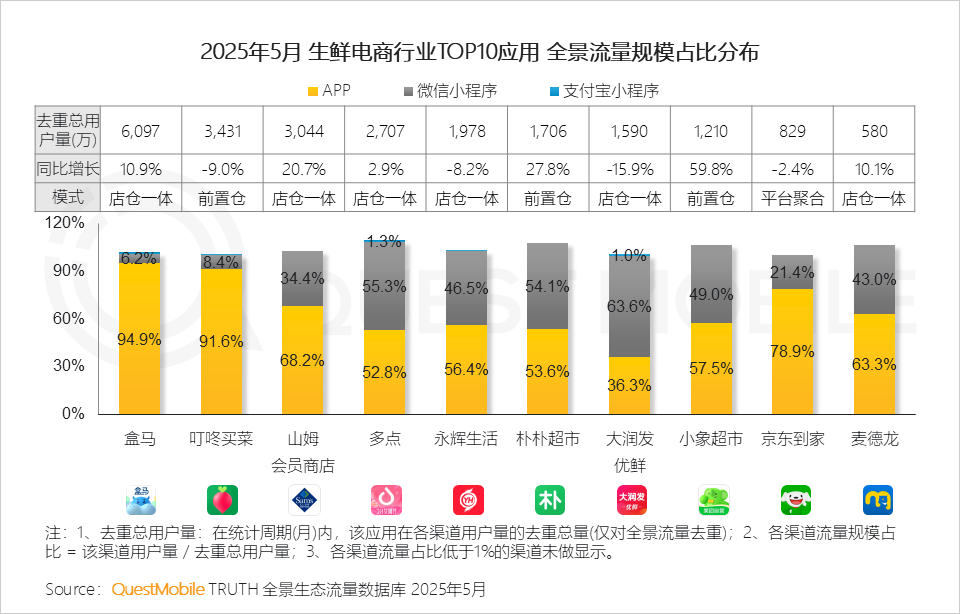 尽管挑战重重,叮咚买菜依然是生鲜电商赛道中不可忽视的头部力量。QuestMobile 数据显示,2025 年 5 月其在生鲜电商领域前 10 的市场份额保持在 15% 左右,与盒马同为市场的领先者。
