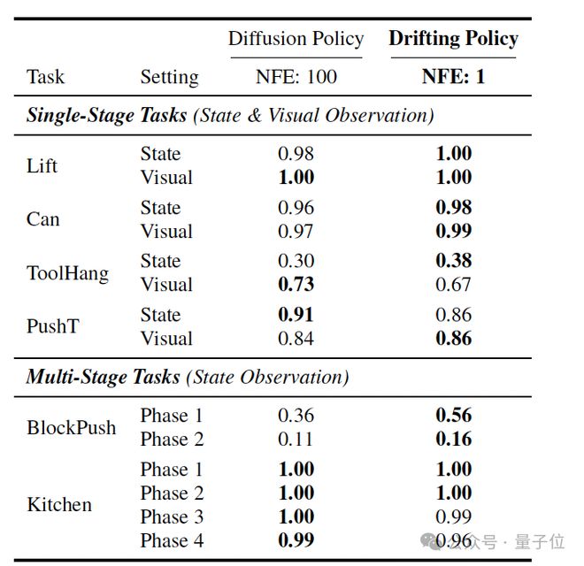 实验表明,其单步推理的决策质量即可匹配甚至超越需要 100 步推理的 Diffusion Policy,极大地降低了实时控制系统的延迟。