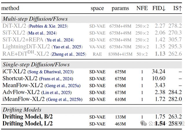 由此,漂移模型将原本昂贵的迭代开销内化在了训练阶段,使得模型在推理时仅需单次前向传播(One-step generation)即可生成高质量样本。