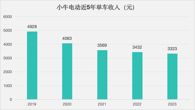 国内外市场双双实现销量的上涨,和小牛电动的"降价"策略有关。小牛电动一直走的是高端化路线,但第三季度单车收入(每辆电动滑板车的收入)为 2970 元,同比下降 5.1%。而这一趋势已经持续了五年,从 2019 年至 2023 年,小牛的单车收入逐年下降,从 4928 元一路降至 3323 元。