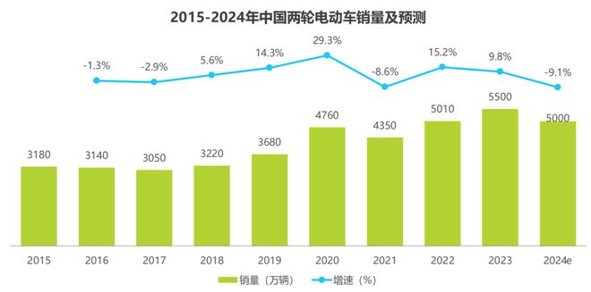 据艾瑞咨询预测,2024 年中国两轮电动车量将同比下降 9.1% 至 5000 万辆。