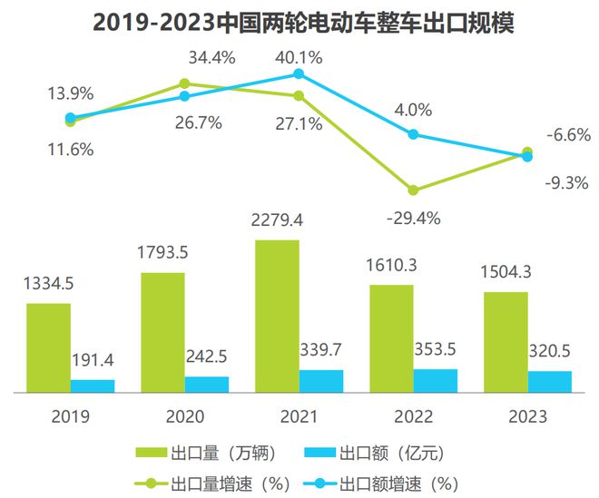 从数据来看,2021 年和 2022 年,受到疫情影响,海外对电动车需求加大,中国电动车出海迎来一波高峰。随着疫情结束,2023 年,中国两轮电动车整车出口量为 1504.3 万辆,出口额为 320.5 亿元,分别同比下降 6.6% 和 9.3%。