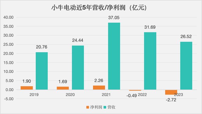 虽然从股权关系上,小牛电动与牛创新能源并没有关系,但造车项目不可避免地分散了创始人的精力,也给了竞争对手机会。正是在 2022 年至 2023 年,小牛电动的营收出现连续下滑,净利润也从 2021 年的盈利变为亏损。