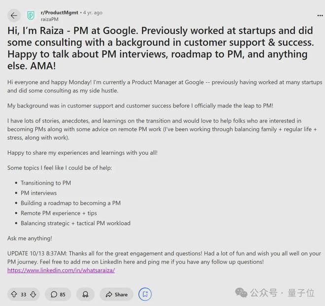可以看出,拉姐自身拥有丰富的产品工作经验。甚至在谷歌期间,还作为特邀嘉宾分享了自己最初从客户支持到产品经理的转型之旅。