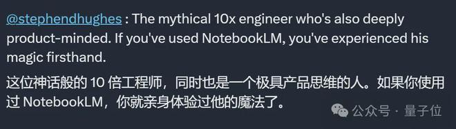 在拉姐看来,休斯是一位传说级的 10 倍工程师。而 NotebookLM 的巨大成功证明,他也是一位极具产品思维的工程师。