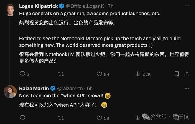 不过,在给从 OpenAI 跳槽到谷歌搞 Gemini API 的同事 Logan Kilpatrick 回复时,拉姐透露: