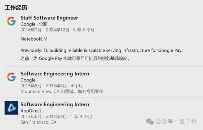 休斯全职在谷歌的时间有 8.6 年,加入 NotebookLM 团队前负责为 Google Pay 构建基础设施。