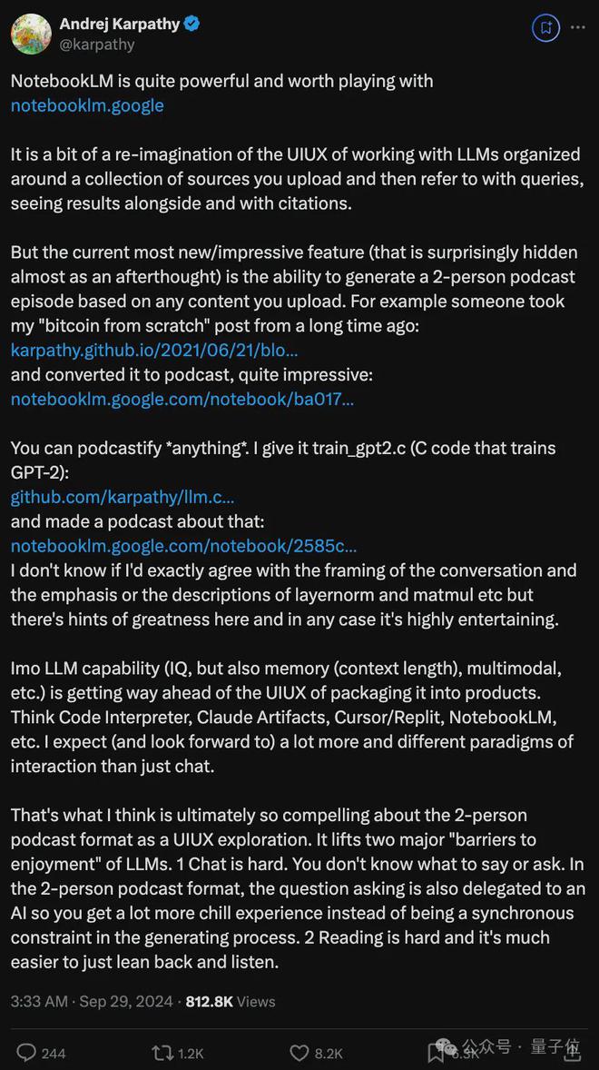 Karpathy 是这样总结其功能的:NotebookLM 消除了人们享用大模型的两大障碍: