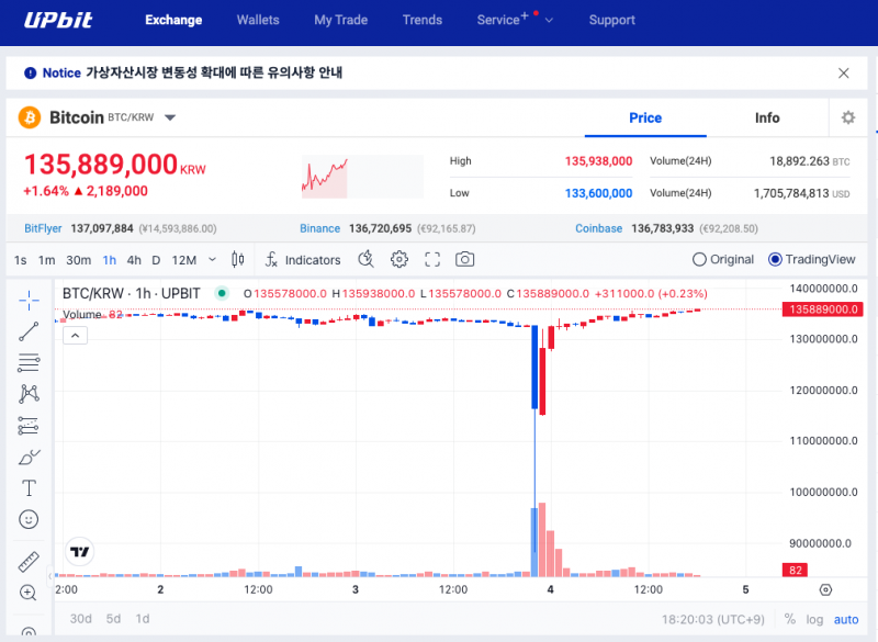 12 月 3 日晚间,或受韩国政治动荡影响,比特币在韩国 Upbit 交易所上的价格瞬间闪崩,在几分钟内下跌了近 30%,一度跌至 6.2 万美元(8800 万韩元)附近,随后又快速回升至正常水平。在此期间,比特币在 Coinbase 等交易所的价格稳定在 9.5 万美元附近。