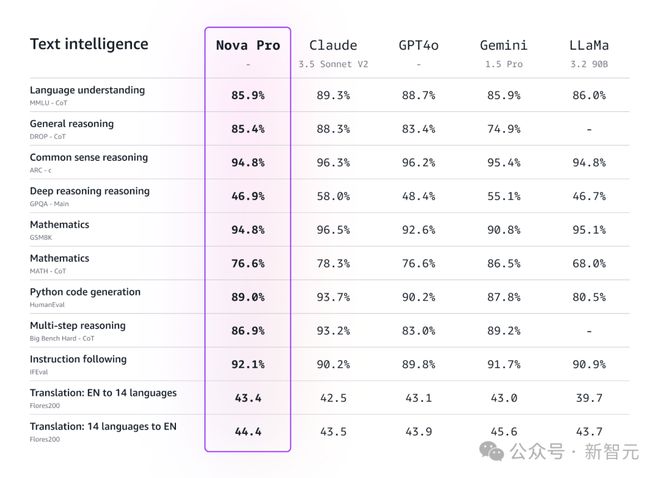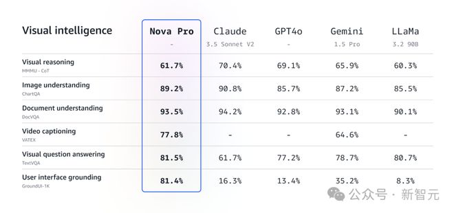 在多项基准测试中,最强的 Nova Pro 成功超越了 GPT-4o,仅次于 Gemini 1.5 Pro、Claude 3.5 Sonnet。