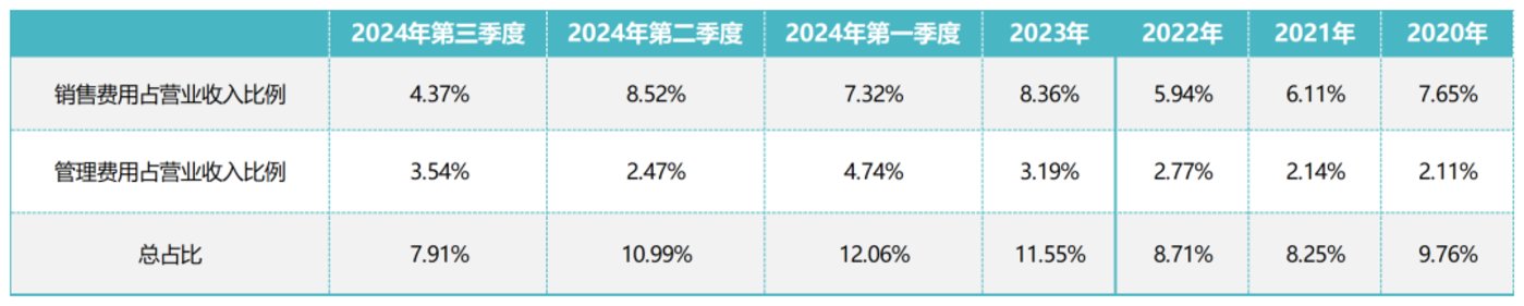 2024 年第三季度期间,格力电器的销售费用与管理费用合计占据营业收入的 7.91%,低于 2020 年-2023 年的数值水平。