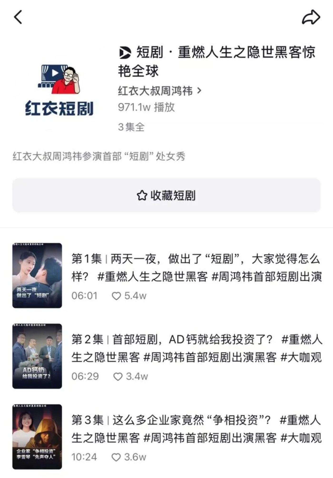 就最终效果而言,“周鸿祎称被逼演短剧”冲上了微博热搜榜单,相关词条#重燃人生之隐世黑客,2 小时内抖音话题量达 54.4W。#周鸿祎直播发布短剧#词条登上抖音社会榜 TOP46,近 50W 人在看。截至目前,该剧仅在抖音平台的播放量就将近 1000 万……可见“含祎量”虽低,但也确实达到了 360 市场部的预期效果。