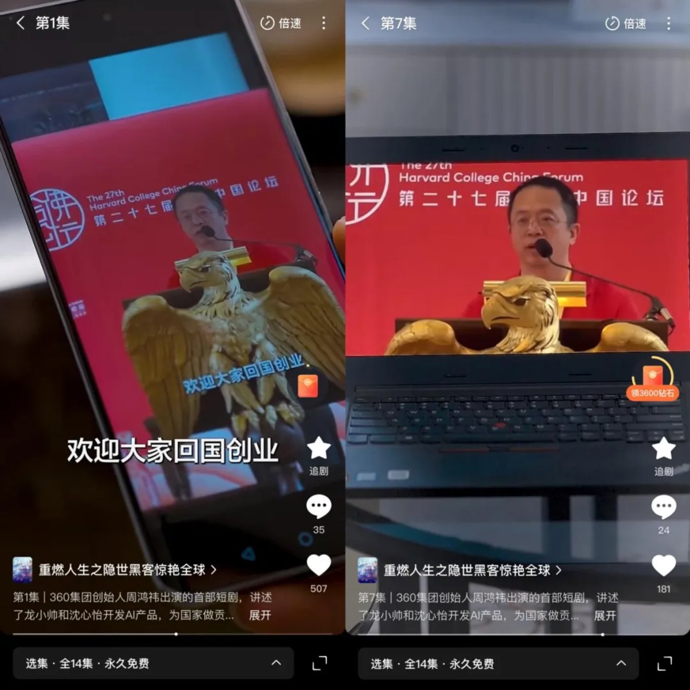 该剧中,周鸿祎饰演的是“红帽黑客联盟”的老大、“365 公司”的老周,因对少东家研发的 AI 项目很感兴趣,还向男女主的项目投资了 1000 亿。不过,全片 14 集,约 22 分钟的总时长里,周鸿祎本人出场时长仅 30 秒不到,可以说是“含祎量”极低了。