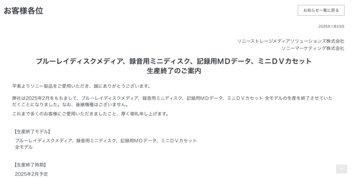 1 月 23 日,索尼发布公告,宣布自今年 2 月起,停止生产所有蓝光光盘、录制迷你光盘、MD 及迷你 DV 磁带等产品。