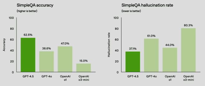 与“情商”进步相关联,GPT-4.5 在 SimpleQA 准确率与 SimpleQA 幻觉率两方面有着不俗的数据表现,分别为 62.5% 与 37.1%,均优于 GPT-4o、OpenAI o1 以及 OpenAI o3-mini 等前代模型。(幻觉率即生成不准确信息的概率,其数值越低越好。)