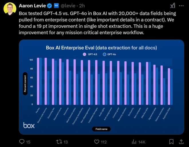 产品性能和使用体验也是 GPT-4.5 的争议之处。Box AI CEO Aaron Levie 指出,他们从企业内容(如合同中的重要细节)中提取了 20000 多个数据字段,GPT-4.5 相比于 GPT-4o,其单次提取的改进幅度为 19 个百分点。他认为,对于任何关键的企业工作流程来说,这都是巨大的改进。