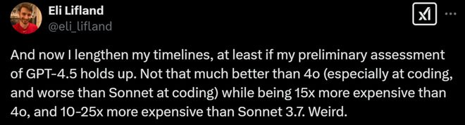 而纽约大学教授 Gary Marcus 则指出,GPT-4.5 基本上毫无用处。有用户实测表示该模型在编码等方面并不比 GPT-4o 好太多,而且在编码方面比 Sonnet 差。还有网友在 OpenAI 的相关博文下留言,称 Grok 更好。而不久之前,马斯克的 xAI 刚刚推出了所谓“世界最聪明的模型”Grok 3。