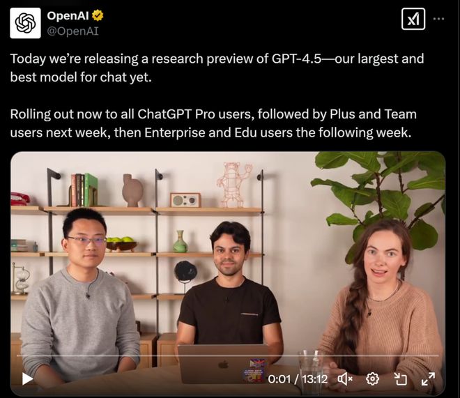 OpenAI 首席执行官奥特曼在社交平台X上的表示:“好消息是,它是第一个让我感觉像是与有思想的人交谈的模型。我有几次坐在椅子上,从 AI 那里得到真正的好建议,这让我感到惊讶。坏消息是,它是一个巨大的、昂贵的模型。”