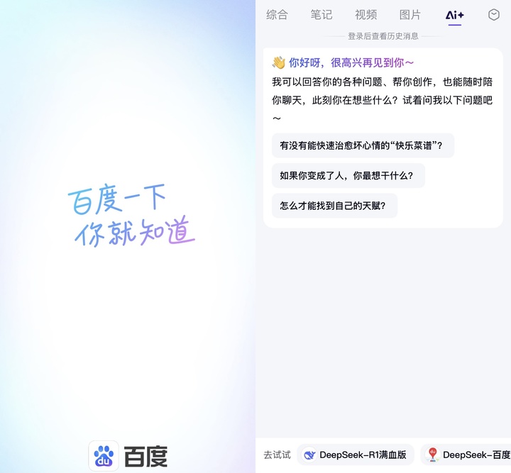 看得出来,百度是下定决心要开放了。百度搜索、自由画布、文心智能体平台,同样接入了 DeepSeek。百度 app 也焕新升级,用回了那句经典口号「百度一下,你就知道」,上线新的「AI 搜索」入口。