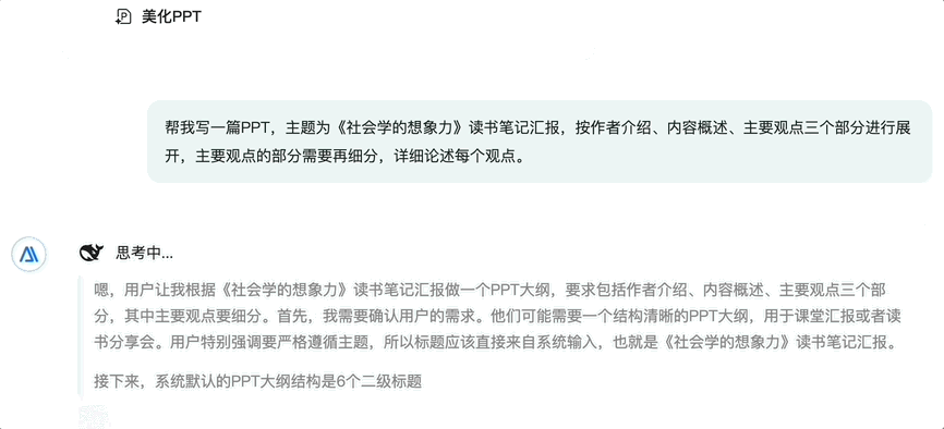 我在输入框填进了以下内容:「《社会学的想象力》读书笔记汇报,按作者介绍、内容概述、主要观点三个部分进行展开,主要观点的部分需要再细分,详细论述每个观点。」