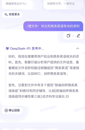 当我要求「找出和商务英语有关的资料」,DeepSeek 开始思考,哪些文件名称和路径明确提到了「商务英语」,或者「BEC」「剑桥商务英语」等相关的关键词。