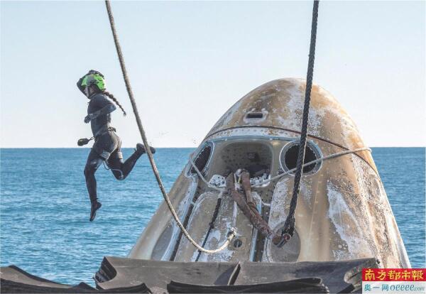 在溅落点附近等待的回收船对飞船进行打捞和安全回收。待飞船被抬升至甲板上固定后,舱门打开,4 名宇航员在医疗团队协助下依次出舱,他们面带微笑向迎接团队挥手致意。据介绍,他们将接受常规医疗检查,随后乘飞机前往位于休斯敦的美国航天局约翰逊航天中心与家人团聚。