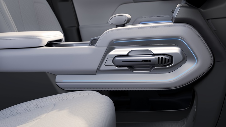坐进车内,C 型环绕的星环氛围灯如同穿越星际隧道的光轨,中央扶手的「灵动岛」藏着两大彩蛋:可爆闪求救的手电筒,以及仅重 170 克的车载麦克风。