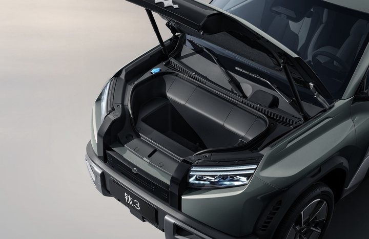 当现场观众还在惊叹于钛 3 的造型设计时,方程豹用更细腻的巧思,让这辆小车变得更具实用性。钛 3 的前盖之下,是一个容量达到了 151L 的电动前备箱,比 Model Y 还要大,中间可放置挡板,分层置物。