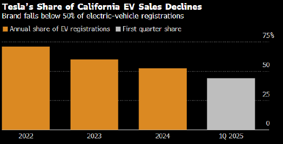 加州新车经销商协会周三表示,特斯拉第一季度在加州的电动车销售份额从一年前的 55.5% 降至 43.9%。虽然特斯拉的注册量下降 15%,但今年年初所有其他电动车的销售却增长 35%。