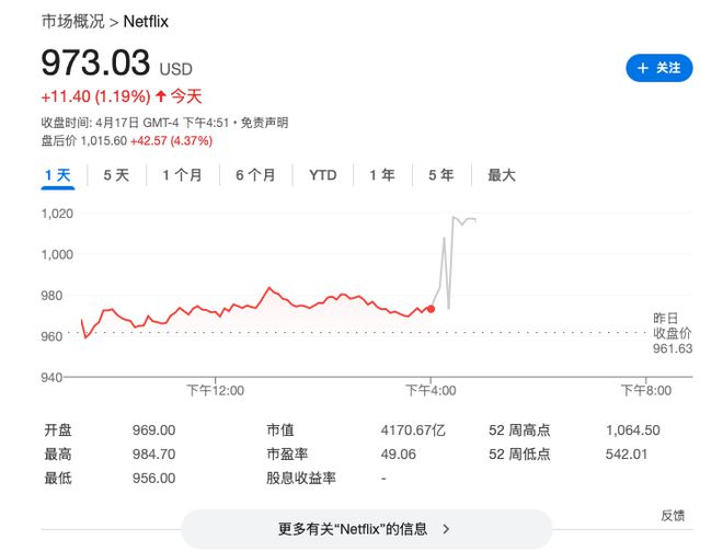 Netflix 正处于经济不确定性环境中表现最突出的“科技巨头”之一,今年以来,Netflix 股价已上涨约9%,在大型科技公司中表现抢眼。财报公布后,Netflix 周四盘后涨超 4.3%,报 1015.60 美元。