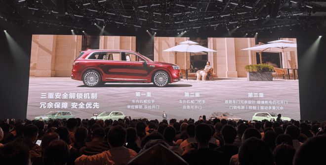 值得一提的是,华为特意展示了门锁安全机制,问界 M8 有三重安全解锁机制,即使碰撞断电仍可开门。